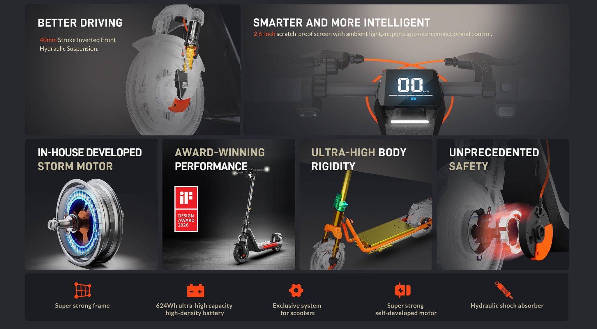 The scooter features a hybrid cradle frame made of 82% steel and 18% aluminum. With strength rated at up to 540 MPa, it delivers outstanding durability, enhanced safety, and greater riding stability.